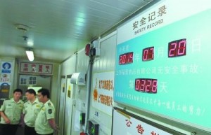 昨晚,上海食藥監管人員檢查上海福喜公司,公司通道內懸掛的電子顯示屏顯示,該公司已328天無安全事故。