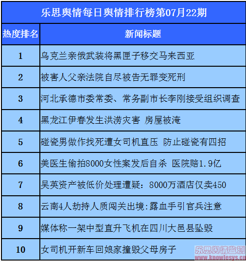 2014年7月22日樂思每日輿情熱點排行榜導讀:烏克蘭親俄武裝將黑匣子移交馬來西亞;被害人父親法院自盡被告無罪變死刑;河北承德市委常委、常務副市長李剛接受組織調查;黑龍江伊春發生洪澇災害?房屋被淹;碰瓷男做作找死遭女司機直壓……