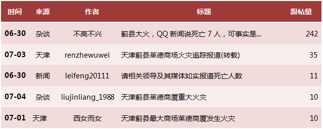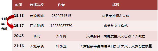 為研究此次火災事件的網絡輿情態勢,此輿情報告主要以百度搜索引擎相關的新聞、新浪微博、天涯論壇、百度貼吧上與“天津薊縣縣城萊德商廈火災”的相關話題作為數據基礎。2012年天津薊縣縣城萊德商廈火災事件專題輿情態勢主要表現出一下幾方面的特點: