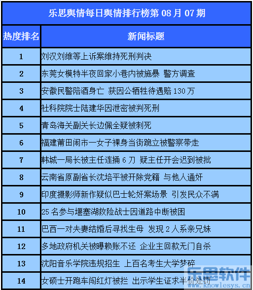 2014年8月7日樂思每日輿情熱點排行榜導讀:劉漢劉維等上訴案維持死刑判決;東莞女模特半夜回家小巷內被施暴?警方調查;安徽民警陪酒身亡?獲因公犧牲待遇賠130萬;社科院院士陸建華因泄密被判死刑;青島海關副關長邊佩全疑被刺死……