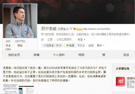 今日凌晨0點,備受網友期待的蘇寧易購“0元閃拍”活動出現瘋狂一幕:一款原價為4518元的深空灰蘋果手機iPhone5S?(16GB)竟然拍出136100元的天價,這讓不少網友唏噓不已。對此,蘇寧云商集團運營總部執行副總裁李斌連夜通過微博發出《關于閃拍出現惡意競拍的處理公告》(以下簡稱:公告),向網友表達歉意的同時,宣傳將緊急出臺兩項風控措施,防止類似惡意競拍的情況發生。