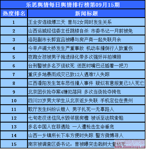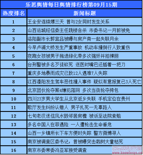 2014年9月15日樂思每日輿情熱點(diǎn)排行榜導(dǎo)讀:王全安連續(xù)嫖三天?曾與2女同時發(fā)生關(guān)系;山西運(yùn)城經(jīng)信委主任跳樓自殺?市委書記一月前被免;洛陽副市長郭宜品被曝與房產(chǎn)商一起失聯(lián)月余;今早盧浦大橋發(fā)生嚴(yán)重事故?機(jī)動車撞倒行人致重傷;夜跑女孩被男子拖進(jìn)綠化帶多次強(qiáng)奸并拍裸照……