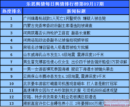 樂思每日輿情排行榜第09-17期:廣州緝毒槍戰致1人死亡1民警受傷