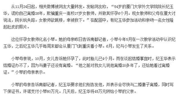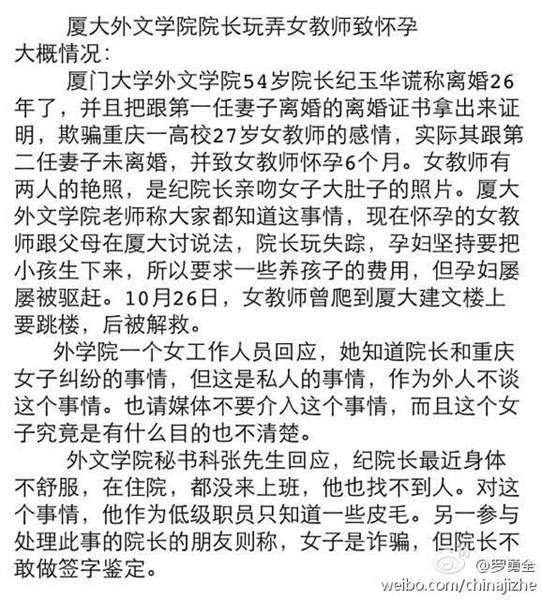 曝光內容顯示,廈門大學外文學院院長紀玉華與重慶一高校27歲女教師發生婚外情,女方還曾到廈大欲跳樓。與此同時,一組被指是紀玉華的艷照在網上熱傳。對此,廈門大學及外文學院尚未回應,但外文學院官網已刪除紀玉華的任職及相關信息。