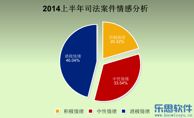 本報告將采集的2752篇司法案件報道進行情感分析,經分析,其中內容情感積極的案件報道562篇,占20.42%;內容情感中性的案件報道923篇,占33.54%;而內容情感消極的案件報道則有1267篇,所占比例為46.04%。總的來說,2014上半年司法案件報道消極偏多,網絡輿情亦負面居多。