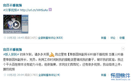 據樂思網絡輿情監測系統采集的信息顯示,10月3日,遼寧阜新“官員不雅視頻”在騰訊微博曝出,視頻上阜新市園林管理處副所長葉某在一修鞋店內撫摸一女子。兩段相關視頻分別攝錄于5月25日和30日。25日視頻時間顯示為9時26分開始,全長2分54秒。視頻中,坐在一名中年女子身后的男子從衣領處伸入女子衣服內撫摸,女子泰然自若。另一段視頻中,該男子走入店內,徑直走到該女子身后摟抱,并幾次在女子身后雙手抱摸其胸部。在2分01秒全長的視頻中,雙方有說有笑,女子也未反抗。