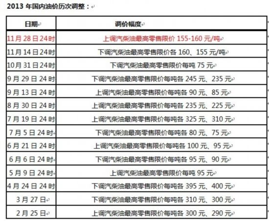 28日,國家發改委發布消息表示,決定自11月29日零時起提高國內成品油價格,汽、柴油價格每噸分別提高160元和155元。