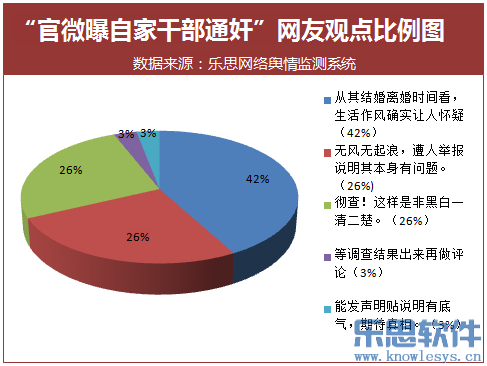 據樂思網絡輿情監測系統監測所得數據看,多數網友對王某的生活作風表示懷疑,認為無風不起浪,而且從其結婚離婚時間看,都值得懷疑,官方應調查清楚。
