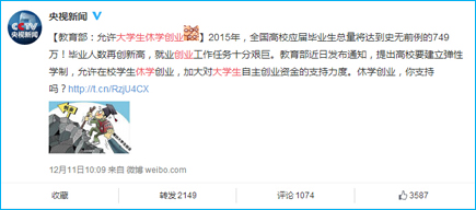 通知發出的10日當天,該話題就受到輿論的關注,輿情聲量為427條;11日,隨著更多媒體參與該話題的報道和評論,話題輿情關注度直線上升,輿情聲量高達2228條;12日該話題輿情關注度依然不減,到12日14時輿情聲量就超過11日達2428條,話題百度實時熱點搜索指數為14929次,仍處在上升之中。新浪微博用戶“@央視新聞”該話題的微博被轉發2149次,評論1074條,獲贊3587次。從整個數據走勢來看,“允許大學生休學創業”話題的輿情關注度在未來兩天依然可能保持高位,大學生休學創業是否可行依舊是輿論爭論的焦點。
