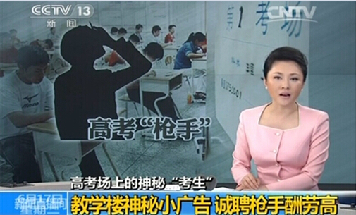6月17日中午,央視新聞?lì)l道曝光河南高考槍手內(nèi)幕,揭露了槍手公司、考生家庭以及監(jiān)考老師之間隱秘的地下鏈條。組織替考者稱,高考前一個(gè)月時(shí)間,他們通過(guò)廁所小廣告在武漢大學(xué)、武漢理工大學(xué)、中南財(cái)經(jīng)政法等高校招募槍手。組織者稱他們能花錢使監(jiān)考各個(gè)環(huán)節(jié)獲得通融,打點(diǎn)一個(gè)考場(chǎng)起步7萬(wàn)元。暗訪視頻中,監(jiān)考老師發(fā)現(xiàn)破綻竟沒(méi)有阻攔,讓“槍手”們順利完成了替考。組織者稱,槍手的酬勞不菲,考上二本2萬(wàn),一本3萬(wàn),重點(diǎn)一本5萬(wàn),名校還可以更多。央視記者已向警方報(bào)案。