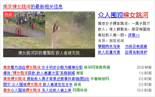 導語:12日開始,一則“南京裸女跳河獲救被圍觀,救人被無視”的消息在上網迅速傳播,引起媒體和公眾的“圍觀”,各大網站紛紛轉載。網文曝光的 “南京裸女跳河獲救被圍觀而救人者被無視”的傳聞引發一波輿論對國人道德素質的反思風波。