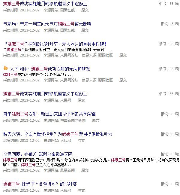 12月2日,隨著嫦娥三號月球探測器由長征火箭發射升空,吸引了各大媒體和廣大網友的關注,僅在12月2日,據樂思輿情監測系統顯示與“嫦娥三號”相關的信息就達到了4654條,上萬網友參與了話題評論。
