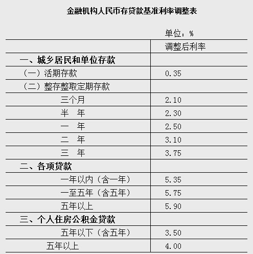 2月28日,中國人民銀行發布通告,決定自2015年3月1日起下調金融機構人民幣貸款和存款基準利率。金融機構一年期貸款基準利率下調0.25個百分點至5.35%;一年期存款基準利率下調0.25個百分點至2.5%,同時結合推進利率市場化改革,將金融機構存款利率浮動區間的上限由存款基準利率的1.2倍調整為1.3倍;其他各檔次存貸款基準利率及個人住房公積金存貸款利率相應調整。