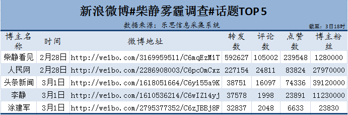 B. 新浪微博#柴靜霧霾調查#話題最熱微博TOP5