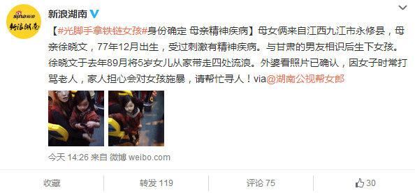 4月8日14時26分,新浪微博認證用戶“@新浪湖南”微博報道稱,光腳手拿鐵鏈女孩身份確定 母親精神疾病。母女倆來自江西九江市永修縣,母親徐曉文,77年12月出生,受過刺激有精神疾病。與甘肅的男友相識后生下女孩。徐曉文于去年89月將5歲女兒從家帶走四處流浪。外婆看照片已確認,因女子時常打罵老人,家人擔心會對女孩施暴,請幫忙尋人。