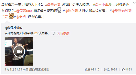 近日,一段“臺灣導(dǎo)游號召大陸游客抵制康師傅”視頻在社交媒體中熱傳,8月2日經(jīng)媒體報道后引發(fā)輿論廣泛關(guān)注。視頻中,臺灣女導(dǎo)游“信誓旦旦”一再表示,由于康師傅被證實(shí)使用餿水油,臺灣各界已掀起“滅頂運(yùn)動”。這名臺灣女導(dǎo)游還話里帶話地表示,“康師傅在大陸使用的餿水油數(shù)量是臺灣的56倍。這個新聞大陸有報道嗎?沒有,但臺灣知道?!?/p>
