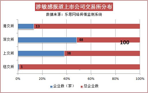 抽樣100篇涉敏感新聞報道數據分析發現,被報道公司來自深交所的達48家,占總量的48%;來自上交所的公司達38家,占總量的38%;港交所13家,占13%,紐交所1家,占1%。