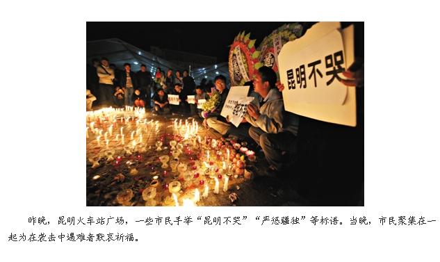 2014年3月3日晚,群眾在昆明火車站的站前廣場上點燃蠟燭,悼念暴力恐怖案中的遇難者。記者從公安部獲悉,3月1日晚發生在云南昆明火車站的嚴重暴力恐怖案,經公安部組織云南、新疆、鐵路等公安機關和其他政法力量40余小時的調查,已于3月3日下午告破。現已查明,該案是以阿不都熱依木·庫爾班為首的暴力恐怖團伙所為。該團伙共有8人(6男2女),現場被公安機關擊斃4名、擊傷抓獲1名(女),其余3名已落網。