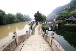 2014年7月7日中午,許多游客們正在風景如畫的浙江紹興市東湖風景區內游覽美景。從高處向外眺望,一墻之隔的浙東古運河,由于被上游洪水污染而呈黃色,但是墻內的東湖水卻是黛青色,水質清澈,魚翔淺底。兩者形成明顯反差。
