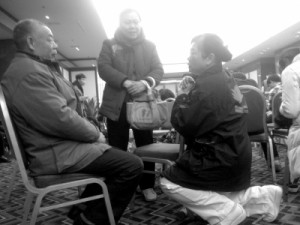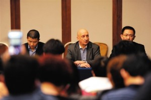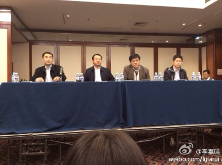 今天中午1點(diǎn),麗都飯店家屬區(qū)內(nèi),舉行新一次通氣會(huì)。外交部、交通部、民航局人士說明情況。外交部領(lǐng)事司副司長(右二)說,他也有親友在飛機(jī)上,幾度哽咽。