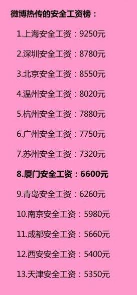 一份未標(biāo)明出處的“全國各大城市安全感工資標(biāo)準(zhǔn)”,由高到低依次是:上海9250元,深圳8780元,北京8550元,溫州8020元,杭州7880元,廣州7750元,蘇州7320元,廈門6600元,青島6260元,南京5980元,成都5660元,西安5400元,天津5350元。