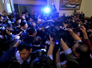 據(jù)媒體報(bào)道,新疆代表團(tuán)開放日提問環(huán)節(jié)結(jié)束后,中外記者就昆明暴恐事件和新疆反恐現(xiàn)狀等問題,繼續(xù)向張春賢追問,在場的近300媒體記者一路圍堵,據(jù)媒體現(xiàn)場描述,有女記者褲子差點(diǎn)被擠掉。又根據(jù)微博內(nèi)容,可知褲子被擠掉女記者為香港衛(wèi)視記者秦楓。