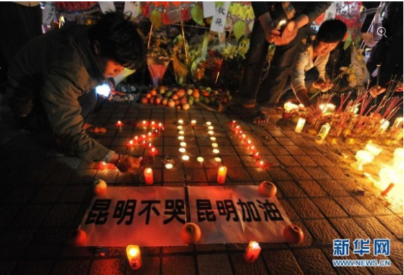 2014年3月3日晚,群眾在昆明火車站的站前廣場上點(diǎn)燃蠟燭,悼念暴力恐怖案中的遇難者。記者從公安部獲悉,3月1日晚發(fā)生在云南昆明火車站的嚴(yán)重暴力恐怖案,經(jīng)公安部組織云南、新疆、鐵路等公安機(jī)關(guān)和其他政法力量40余小時(shí)的調(diào)查,已于3月3日下午告破。現(xiàn)已查明,該案是以阿不都熱依木·庫爾班為首的暴力恐怖團(tuán)伙所為。該團(tuán)伙共有8人(6男2女),現(xiàn)場被公安機(jī)關(guān)擊斃4名、擊傷抓獲1名(女),其余3名已落網(wǎng)。