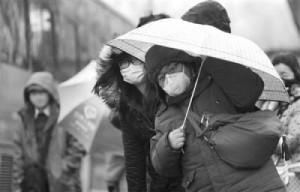 昨日,北京華貿橋,一位戴口罩的乘客撐著傘等公交車。當天傍晚降小雨,緩解了連日來的霧霾。