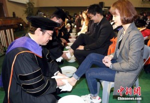 據中新網消息,當地時間2014年2月25日,韓國釜山,一所大學在入學典禮上舉行“洗足儀式”,校長和教授們親自為學生洗腳,以表達對學生的關愛。