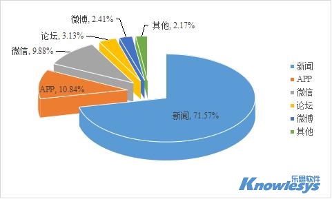 樂思軟件輿情監測數據顯示,截至目前此次輿情監測媒體構成類型中,排在采集來源榜前三位的是新聞、APP和微信。新聞是重要的信息傳播平臺,數據占比為71.57%,APP和微信分別占10.84%和9.88%。