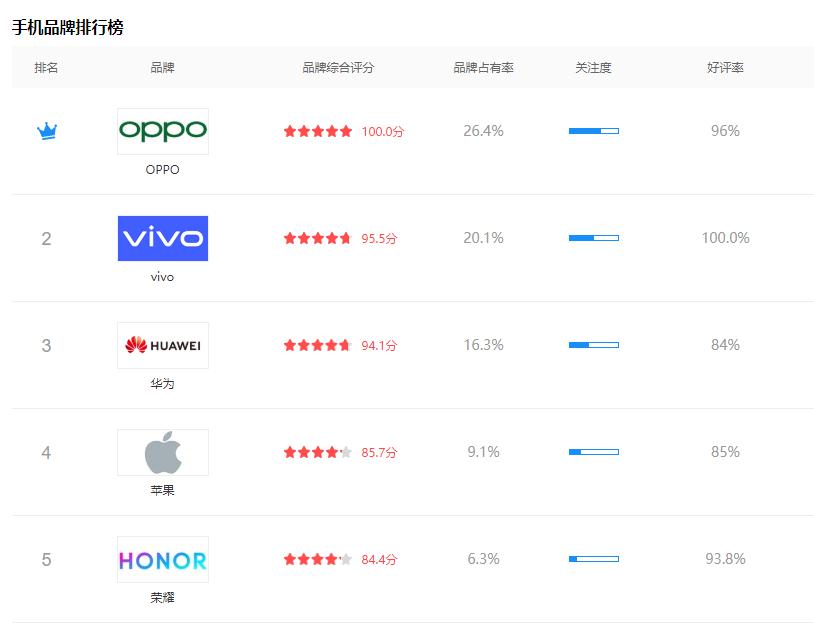 排名第一的OPPO品牌綜合評分100.0分,品牌占有率26.4%,?關注度高,好評率96%;其次是vivo,品牌綜合評分95.5分,品牌占有率20.1%,?關注度較高,好評率100%;第三是華為,品牌綜合評分94.1分,品牌占有率16.3%,?關注度較一般,好評率84%。
