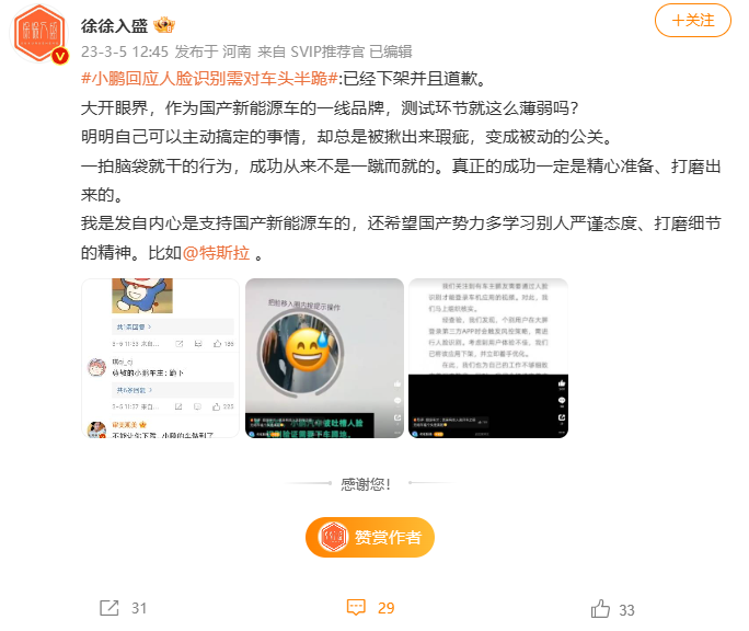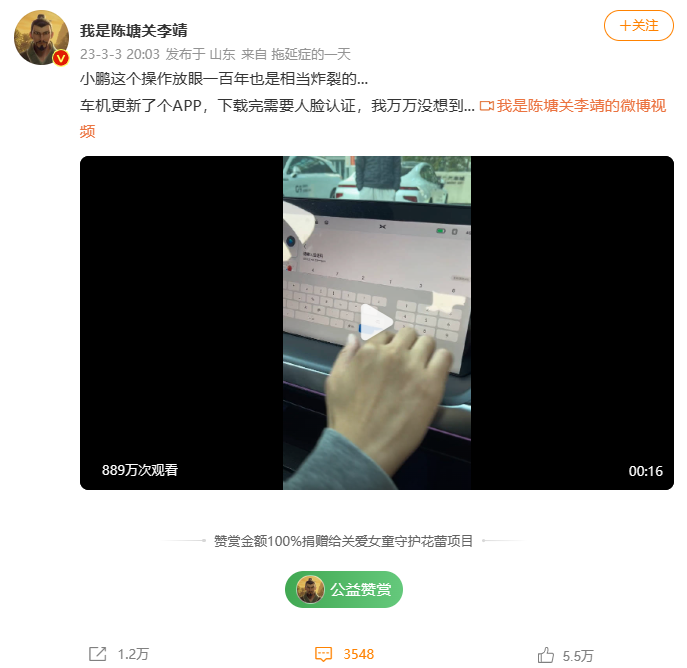 該事件是發生在3月3日,一微博名稱為“我是陳塘關李靖”的博主在其微博發布了一條關于小鵬汽車人臉識別的視頻,還配文表示:“小鵬這個操作放眼一百年也是相當炸裂的… 車機更新了個APP,下載完需要人臉認證,萬萬沒想到…”