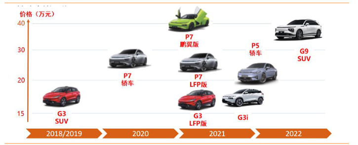 小鵬汽車產品線如下,目前以P7和P5為主。2022年Q3車型銷量占比為:P7占57%,P5占29%,G9占0.6%。