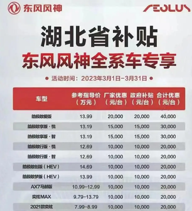 3月6日,一組關于“湖北史上最強購車優惠季開啟”的宣傳海報引起廣泛關注。時代財經注意到,3月以來,湖北省聯合了多家車企推出了大額的政企購車補貼,包括東風本田、東風日產、東風雪鐵龍、東風標致、東風風神等,最高補貼9萬元。