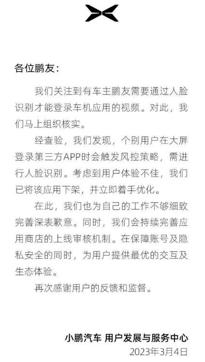 針對此事,小鵬汽車3月4日進行了回應:“我們關注到有車主鵬友需要通過人臉識別才能登錄車機應用的視頻。對此,我們馬上組織核實。經查驗,發現,個別用戶在大屏登錄第三方APP時會觸發風控策略,需進行人臉識別。考慮到用戶體驗不佳,我們已將該應用下架,并立即著手優化。在此,我們也為自己的工作不夠細致完善深表歉意。同時,我們會持續完善應用商店的_上線審核機制。在保障賬號及隱私安全的同時,為用戶提供最優的交互及生態體驗,再次感謝用戶的反饋和監督。”