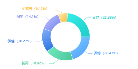 2023年3月3日至2023年3月13日,各渠道信息總量分布比例圖如下,其中微博占比最高為20.41%,新聞占比第二為18.92%,微信占比第三為16.24%,APP占比第四為14.1%。企鵝號占比第五為6.42%,其他占比23.88%。