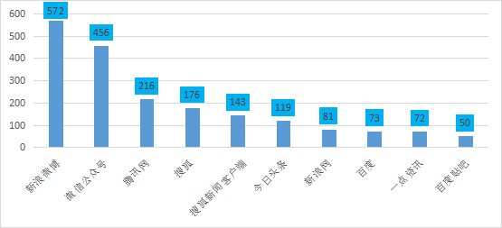 2023年3月3日至2023年3月13日,信息量最高的前十大網站如下圖,新浪微博和微信公眾號最高。