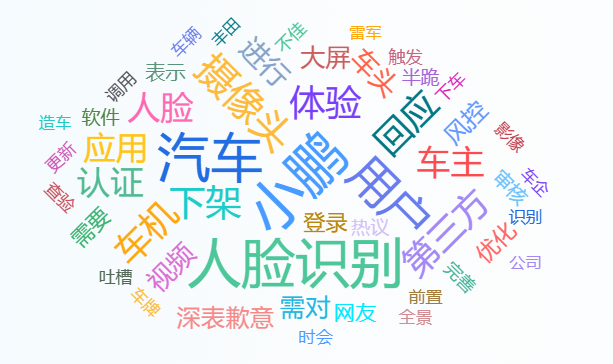 從樂思輿情監測系統解析的云圖來看,“小鵬”、“人臉識別”、“汽車”、“用戶”、“下架”、“第三方”等是提及的高頻詞匯。