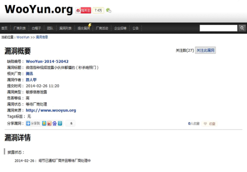 26日,有關“微信視頻存在漏洞”的信息在網上遭到瘋傳。來自樂思微博輿情監測系統監測到信息顯示,該消息最早由新浪微博用戶“@互聯網的那點事”與26日11時50分曝光,隨后該微博被“@烏云—漏洞報告平臺”確認,引發輿論的廣泛熱議。至27日10時,“微信漏洞”以30889次的搜索指數位居實時熱點排行榜第三名。