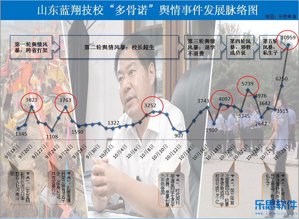 來自樂思網絡輿情監控中心“藍翔技校”專題的監測數據顯示,從9月18日媒體曝出藍翔副校長率學生跨區打架事件開始至10月28日,該話題輿情出現過5次輿情高潮,稱總體趨勢表現為上升走高。9月18日媒體曝出藍翔跨省打架事件,20日藍翔“打掃衛生”回應引發輿論的第一波高潮;9月24日藍翔校長之妻再次曝出榮蘭祥超生事件,直接導致了25日的第二次輿情高潮;10月14日,媒體曝出藍翔存在學生退學不退費,學校暴利暴力等問題,隨后輿情關注量出現上漲,到18日出現了第三次輿情高潮;10月22日,面對日益高漲輿情危機,藍翔校長首度出面回應,但是妻子邪教成員說、社會仇富說引來輿論的強烈不滿,當天輿情聲量急劇上升,達到第四次輿情高潮,隨后輿情開始出現大幅回落;然而在輿情熱度出現冷卻的時候,10月26日,榮蘭祥妻子再次向媒體爆料其余多名女員工有染并有私生子一事,結果把話題輿情推到了第五次高潮,28日當天該事件輿情聲量達10959條。