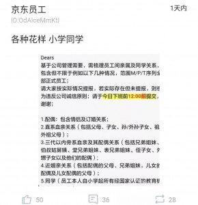知名法律博主@談典看法、法律從業者郭小明認為,京東這種梳理員工親屬同學關系的管理方式,初衷是實現企業的知情權,但卻與我國憲法和法律中的公民個人隱私權相沖突。“要求員工提供親屬同學情況,是沒有法律依據的。這一點雖然沒有在《勞動法》中有禁止性規定,但違反了《民法》《侵權責任法》等法律關于隱私權的規定。”