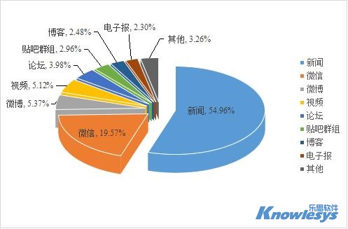 樂思軟件輿情監(jiān)測數(shù)據(jù)顯示,截至目前此次輿情監(jiān)測媒體構(gòu)成類型中,排在采集來源榜前三位的是新聞、微信和微博。新聞是重要的信息傳播平臺,數(shù)據(jù)占比為54.96%,微信和微博分別占19.57%和5.37%。
